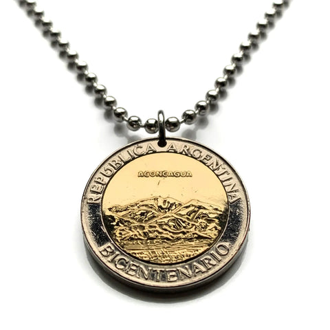 2010 Argentina 1 Peso coin pendant Aconcagua mountains Las Heras Principal Cordillera Seven Summits Andes Mendoza Cuyo San Juan La Rioja Valle de las Vacas Cordón de los Dedos glaciar de Polacos glaciers Camp berlin Camp Colera Nido de Cóndores n000832