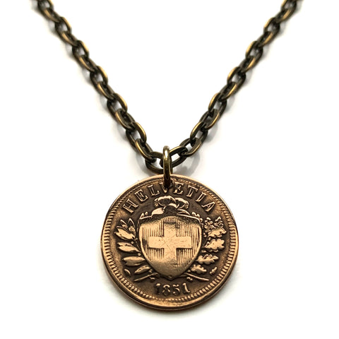 1851 Switzerland Helvetia 2 Rappen coin pendant Swiss cross Zurich Geneva Bern Basel Lausanne Winterthur Lucerne Saint Gallen Lugano Vaud Aargau Schwyz Grisons Valais Biel Bienne Thun Ticino Uri Alpine Jura Alphorn Lauterbrunnen Köniz Fribourg n000908