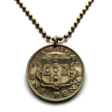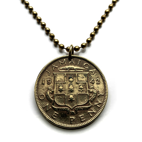 1942 British Jamaica 1 Penny coin pendant World War 2 era alligator pineapples Kingston Portmore Spanish Town Montego Bay May Pen Mandeville Old Harbour Savanna-la-Mar Ocho Ríos Jamdung Patois Ackee dub ska Caribbean Marcus Garvey Rastafari Reggae n001049