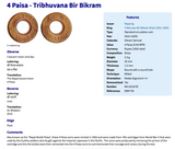 front: Also known as "Nepal Bullet Paisa", These 4 Paisa (1955 AD) coins were minted from World War II rifle bullet casing which was used by the Gurkha soldiers who fought against the Japanese in the Pacific. The Bullets were converted into Paisa to commemorate their courage and vigor during the war.