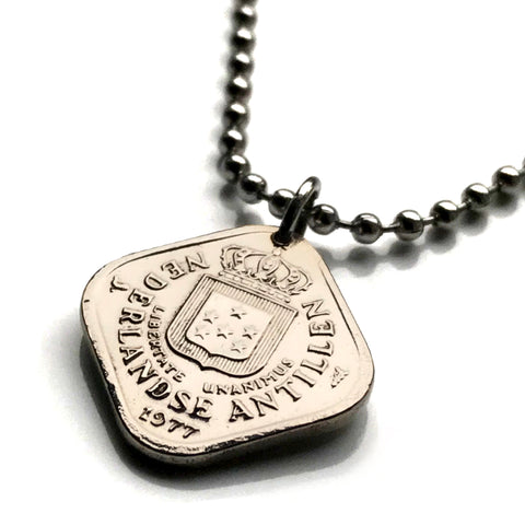Netherlands Lesser Antilles Curacao coin pendant necklace jewelry Orange blossom flower seashell waves Dutch Aruba Bonaire Saba Sint Eustatius Sint Maarten Willemstad Land Curacao Nederlandse Papiamentu Caribbean Pais Korsou Curacaoan Jan Thiel beach