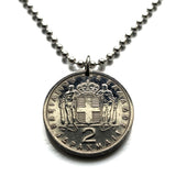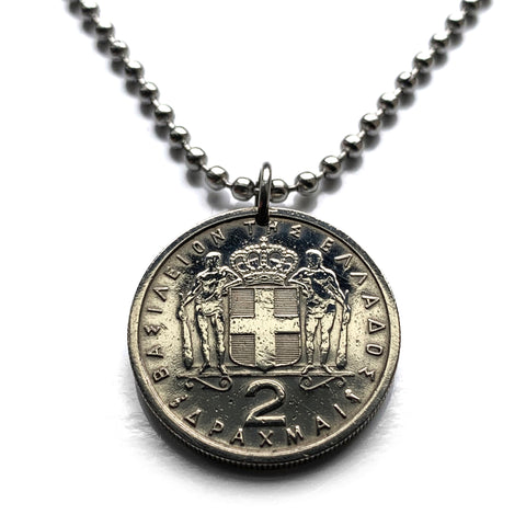 1962 Greece Hellas 2 Drachmai coin pendant Greek white cross The Blue & White Paul I Heracles Athens Thessaloniki Patras Larissa Rhodes Santorini Crete Mykonos Corfu Hellenic Argos Meteora Pella Halkidiki Corinth Ioannina Attica Sparta Thebes n001796