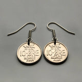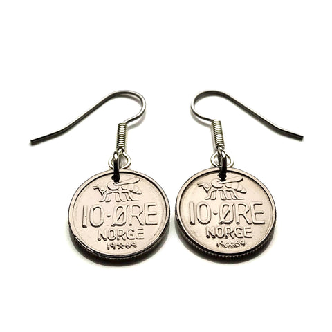 Norway Norge Noreg 10 Ore coin earrings fashion jewelry Norwegian honey bee bumble bee keeper honeycomb pollination Oslo Bergen Stavanger Sandnes Bokmål Nynorsk Scandinavia Hordaland Nordic Trondheim Norse Drammen Ålesund e000061