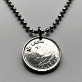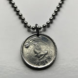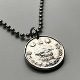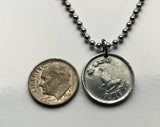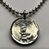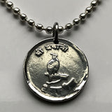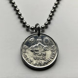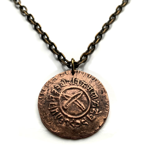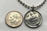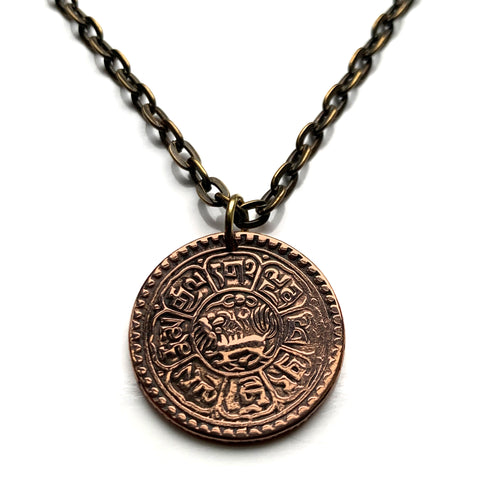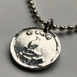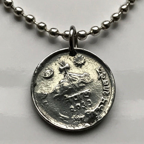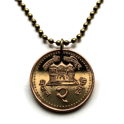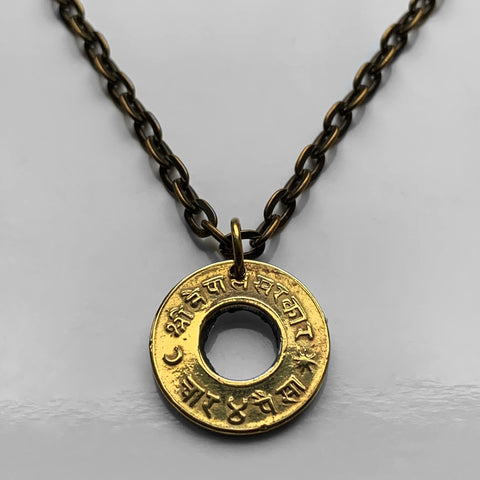 1976 Nepal 2 Paisa coin pendant necklace jewelry trishula trident Himalayas moon sun Kathmandu Nepalgunj Biratnagar Dhangadhi Kirtipur Devanagari n002511