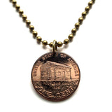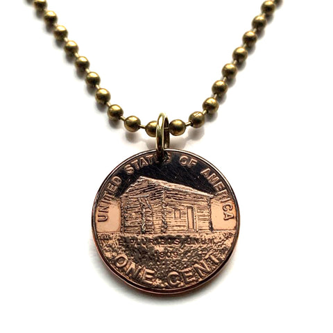 USA United States of America Penny 1 Cent coin pendant necklace jewelry president Abraham Lincoln log cabin 1809 Honest Abe American Civil War Union the North Gettysburg Address Emancipation Proclamation Kentucky Indiana Elizabethtown Washington D.C. New York California Illinois South Carolina Massachusetts New Jersey Mount Rushmore Lincoln Memorial Macon Coles County New Salem Black Hawk War Stephenson County Kellogg's Grove