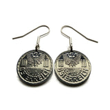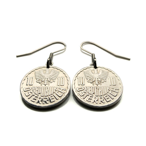 1994 Austria Osterreich 10 Groschen coin earrings fashion jewelry Austrian eagle Habsburg shield Vienna Wien Salzburg Innsbruck Graz Linz Tyrol Villach Carinthia Sankt Polten Wels Solden Ischgl Gmunden Vorarlberg Hallstatt Styria Edelweiss Alpine e000567