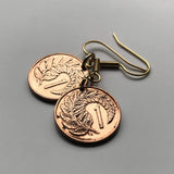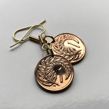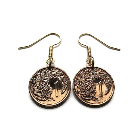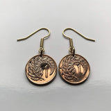 1985 New Zealand 1 Cent coin earrings Kowhai Silver fern leaf ponga Kiwi Wellington Maori Taonga Polynesian Queenstown Hahei North Island waka haka dance UK Te Waipounamu Christchurch Hamilton Tauranga Cook Strait Waikato Milford Sound Rotorua e000027