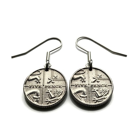 for a: United Kingdom UK Great Britain 5 Pence coin earrings jewelry British Royal Shield of Arms England English lion Scotland Scottish lion Northern Ireland Irish harp Cláirseach Wales red Welsh dragon Ulster Banner London Manchester Edinburgh Belfast Glasgow Liverpool Cardiff Nottingham Yorkshire Birmingham Scottish Thistle of Lorraine dangle & drop hook Gaelic harp Celtic Heraldic badge St Andrew's Cross The Saltire Aberdeen Dundee Paisley