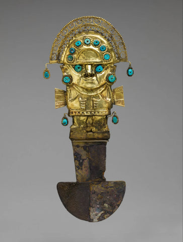 front: "Tumi de Oro", a typical Peruvian short-bladed (semi-circular) knife with the mythological figure of "Ñaylamp" (Lambayeque Culture) as the handle.