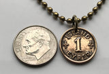 note: tiny coin Iceland 1 Eyrir {1926-1942} FEATURING front: Royal monogram of King Christian X of Denmark topped with a crown. Lettering: ÍSLANDS KONUNGUR Translation: Kingdom of Iceland At the beginning of World War II, Iceland was a sovereign kingdom in personal union with Denmark, with King Christian X as head of state. Iceland officially remained neutral throughout World War II. However, the British illegally invaded Iceland on 10 May 1940. On 7 July 1941, the defence of Iceland was, again illegally, transferred from Britain to the United States, which was still a neutral country until five months later. On 17 June 1944, Iceland dissolved its union with Denmark and the Danish monarchy and declared itself a republic, which it remains to this day. • quantity 1 • demonetized {no longer in circulation} polished Bronze coin • diameter: 15 mm {tiny coin} • weight: 1.57 g ***Choose from drop down menu *** {2 mm thick cords} 22" black cotton necklace 24" brass ball chain {lightweight 5 g} 2-1/2" brass snake keychain with snap end {see last photo} **If you need a different length cotton necklace, leave a note upon checkout** facebook.com/coinedJewelry instagram.com/coinedJewelry twitter.com/coinedJewelry pinterest.com/coinedJewelry tumblr.com/blog/coinedJewelry