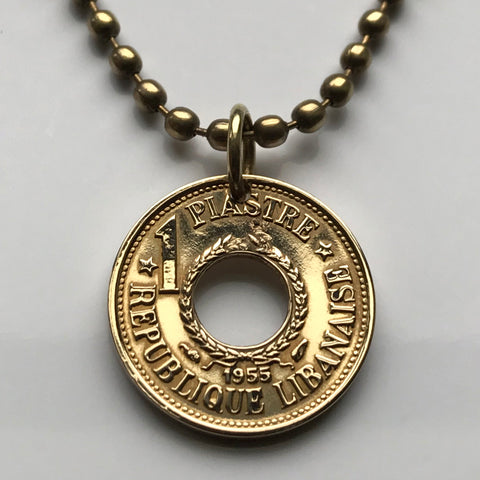 1955 Lebanon Liban 1 Piastre coin pendant Lebanese tree Beirut Tripoli Aley Jounieh Anjar Bsharri arab Zahlé Sidon Byblos Tyre The Levant Middle East Phoenician Beqaa Valley Cedars of God Mount Lebanon Mediterranean n001019