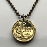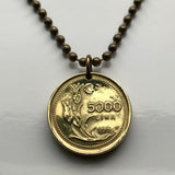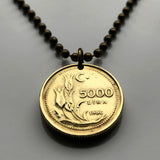 1996 Turkey Türkiye 5000 Lira coin pendant Mustafa Kemal Ataturk crescent moon star tulip flower sprigs Istanbul Ankara Mardin Antalya Canakkale Troy Trabzon Anatolia Göreme Kaş Ephesus Cappadocia Hierapolis İzmir Bursa Hattusa Levent Ottoman n003434