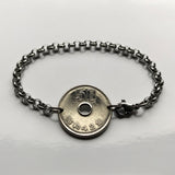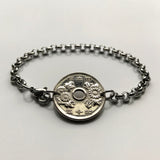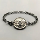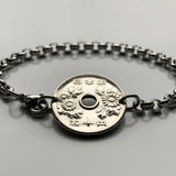 Japan Nippon 50 Yen Japanese coin bracelet jewelry Chrysanthemum flower Tokyo Osaka Kobe Kyoto Yokohama Sendai Nagoya Sapporo Okinawa Chiba Kawasaki Fukuoka Kanji Hiroshima Shibuya mums b000053