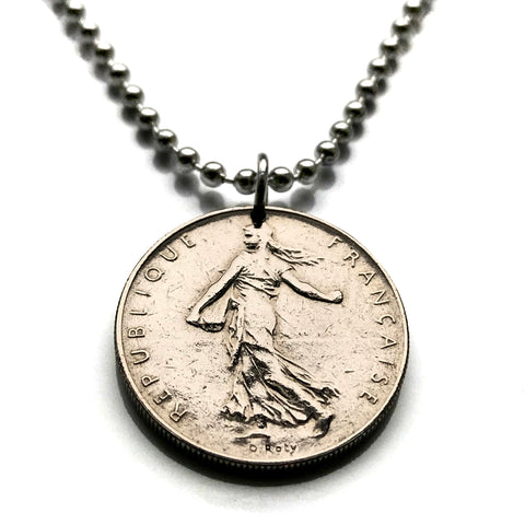 1969 France 1 Franc coin pendant La Semeuse the Sower and the Seed French jewelry Paris Marseille Lyon Toulouse Mont Saint-Michel Nice Strasbourg Bordeaux Versailles Le Havre Rennes Reims Toulon n000627