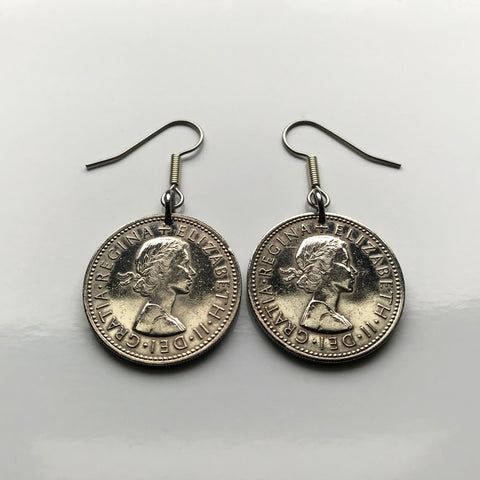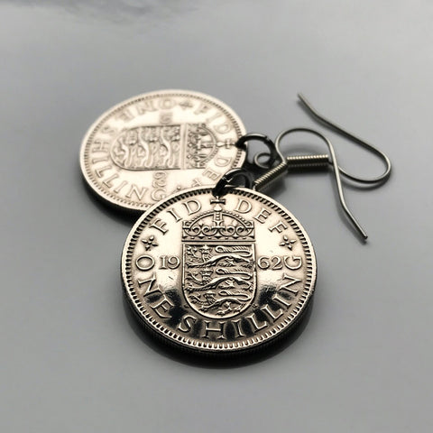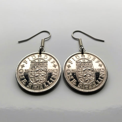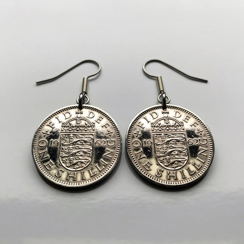 1962 England 1 Shilling coin earrings English shield 3 lions royal arms London Manchester Liverpool Nottingham Sheffield Bradford Birmingham Newcastle Leeds Bristol Southampton United Kingdom e000404