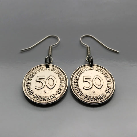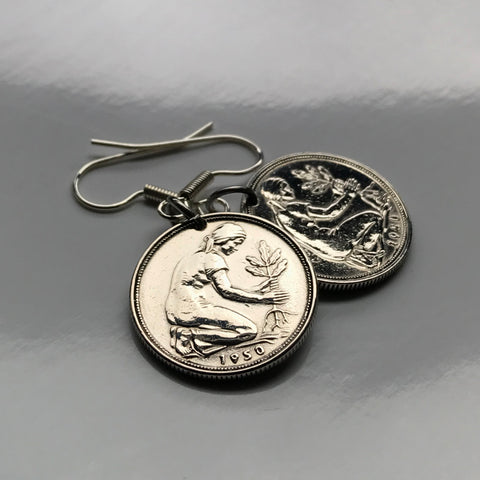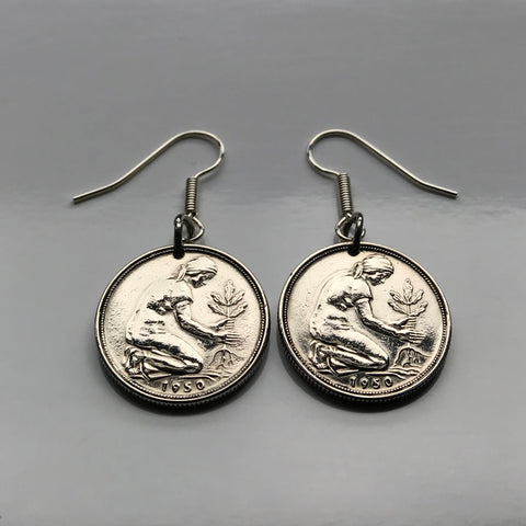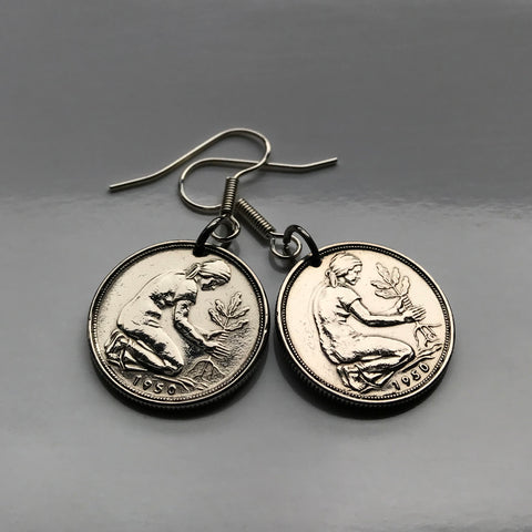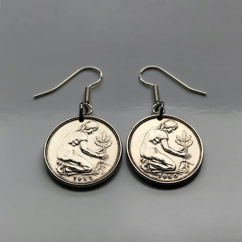 Germany Deutschland 50 Pfennig German coin earrings planting tree Berlin gardener Frankfurt Hamburg Stuttgart Cologne Düsseldorf Bavaria Bremen Dresden Hanover Nuremberg Leipzig Essen Hesse seedling e000064