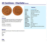 front: Crowned and adorned shield with a Luxembourgish lion with a forked tail, crawling on the left, on a field of ten pieces, below the name of the country between two rhombs.