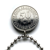 Central African States coin pendant necklace African jewelry cacao cassava crops agriculture Cameroon Central African Republic Chad Equatorial Guinea Gabon Congo Yaoundé Bangui N'Djamena Libreville Brazzaville Douala Bafoussam Bamileke people Kamtok language N'Djamena Sahel region Bateke eland antelope rim gazelle