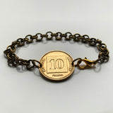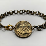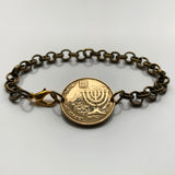 1987 Israel 10 Agorot coin bracelet jewelry Jewish menorah candelabrum Hanukkah Jerusalem Palestine Tel Aviv Haifa Rishon LeZion Petah Tikva Torah Hebrew Judea Samaria Talmud Ashdod Netanya Beersheba Jaffa Holon Caesarea Talmud Judaism Zion b000130