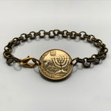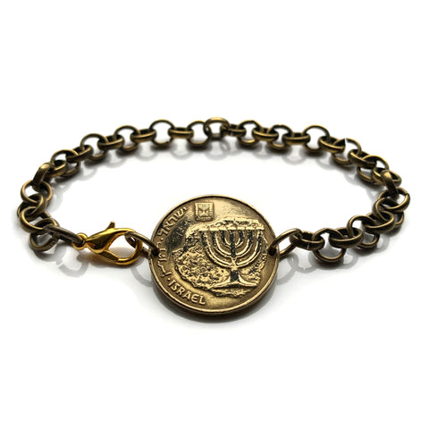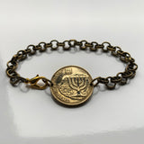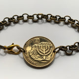 Israel coin chain rolo link bracelet jewelry Jewish menorah candelabrum Hanukkah Jerusalem Judea Samaria Tel Aviv Haifa Rishon LeZion Petah Tikva Ashdod Netanya Beersheba Holon Safed Nazareth Palestine Weat Bank bar mitzvah gift Simon bar Kokhba Middle East rabbinic Shekel Judaica Zion Bet HaMikdash Holy Temple Hebrew Yiddish Judaism Torah Moses Arch of Titus Judean Yiddish Kinara ancient Temple Tabernacle Star of David