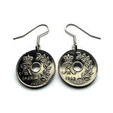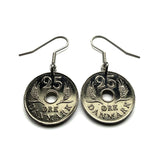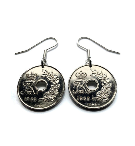 1969 Denmark Danmark 25 Ore coin earrings Danish crown initial R Copenhagen Aarhus Odense Aalborg Esbjerg Danes Randers Kolding Horsens Funen Jutland Viking Scandinavia Nordic Roskilde Syddanmark Aabenraa Hillerød Zealand Vendsyssel Faroese Amager e000601