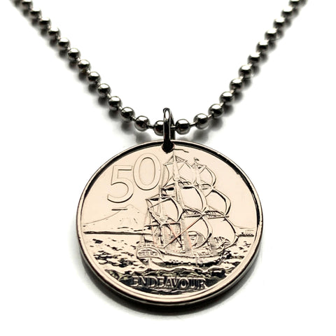 2006 New Zealand 50 Cent coin pendant HMS Bark Endeavour ship James Cook Wellington Auckland Marae Koruru Hawaiki North South Island haka dance Te Reo Te Waipounamu Christchurch Hamilton n003849