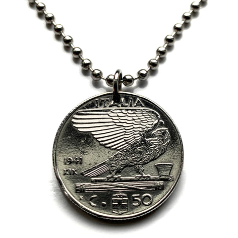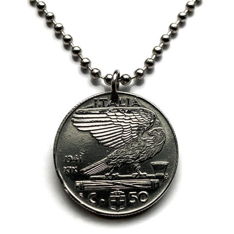 1941 Italy 50 Cent coin pendant World War 2 era Italian eagle Savoy shield fascist Mussolini Roma Milano Florence Venice Torino Genoa Verona Perugia Assisi Siena Palermo Cagliari Napoli Parma Bologna Modena Lecce Pisa Capri Tuscany Matera Bergamo n000345