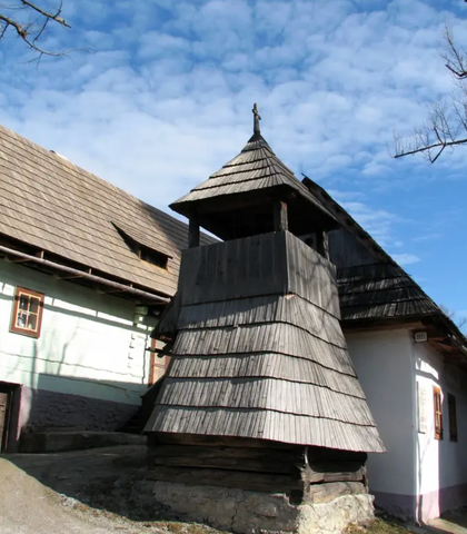 front: The octagonal wooden belfry with the shingled roof dating back to the beginning of the 19th century.