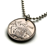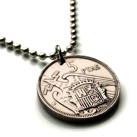 1957 España Spain 5 Pesetas Spanish jewelry coin pendant escudo Español aguila de San Juan Madrid Barcelona Sevilla Málaga Córdoba Valencia Granada Zaragoza Toledo Cadiz Bilbao Coruña Cuenca Ibiza Cataluña Plus Ultra Castile Leon Aragon Navarre n000499