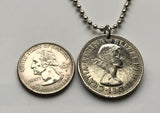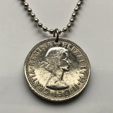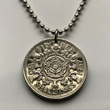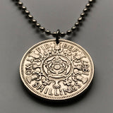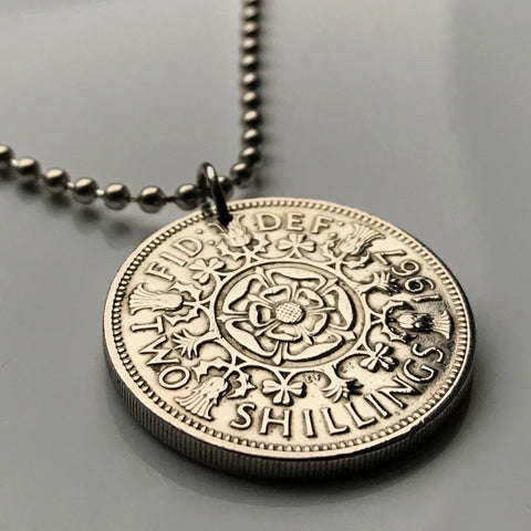 United Kingdom Great Britain 2 Shillings coin pendant English tudor rose England Scottish thistle Scotland Irish shamrock Northern Ireland Welsh leek Wales Wars of the Roses London Edinburgh Belfast Cardiff Manchester Sheffield Liverpool n001772