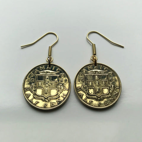1962 British Jamaica 1/2 Penny coin earrings crocodile alligator pineapples Kingston Montego Bay May Pen Jamrock Jamdung Patois Ackee dub ska Caribbean Patwah Ocho Ríos Portmore Marcus Garvey Rastafari Bob Marley Reggae Spanish Town Mandeville e000266
