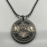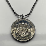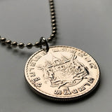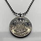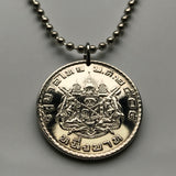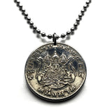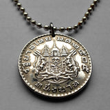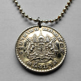 Tailandia Siam moneda colgante collar joyería tailandesa Gajasiha Rajasiha Bangkok escudo de armas emblema Chakra Trisula elefantes Orden de las Nueve Gemas Bhumibol Adulyadej templo budista Airavata Wat Arun templo Dinastía Chakri Garuda Gajasimha Siamés Ciudad de Nonthaburi Pak Kret Krung Thep Joyería tailandesa