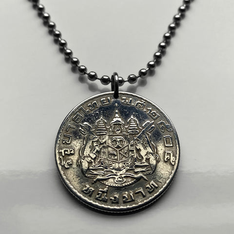 1962 Tailandia Siam 1 Baht moneda colgante Gajasiha Rajasiha Bangkok escudo emblema Chakra Trisula elefantes Orden de las Nueve Gemas Bhumibol Adulyadej templo budista Airavata Wat Arun templo Chakri Garuda Gajasimha Nonthaburi Pak Kret Krung Thep n000265