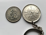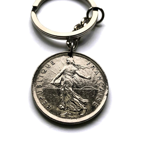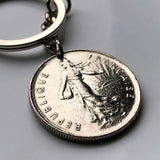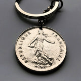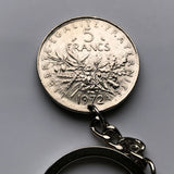 1975 France 5 Francs coin keychain jewelry La Semeuse Sower & Seed Paris Lyon Marseille Lille Toulouse Bordeaux Nantes Strasbourg Montpellier Rennes Grenoble Rouen Nice Toulon Tours Nancy Clermont-Ferrand Saint-Étienne Havre Mont Saint-Michel Metz k000027