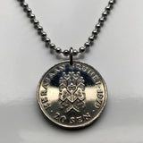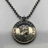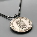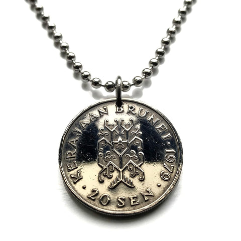 Brunei moneda colgante collar joyería oblongo patrón árbol diseño Bandar Seri Begawan Kuala Belait Tutong Brunei-Muara Temburong Seria Jawi Malay Kedayan Tutong idioma Tasek Merimbun lago Kampong Ayer Malasia Brunei Darussalam Sarawak Borneo