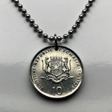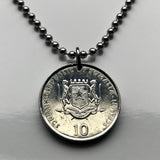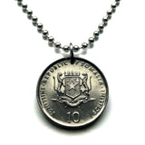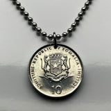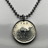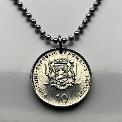 Colgante de moneda de 10 chelines de Somalia de 2000, 2 leopardos, estrella blanca de la unidad, camello somalí, collar con escudo coronado de Soomaaliya n.º 001605