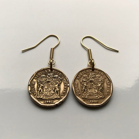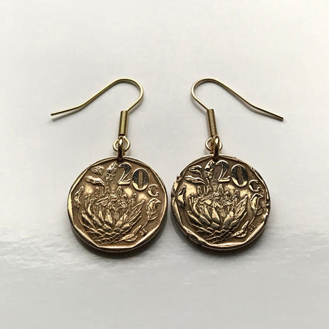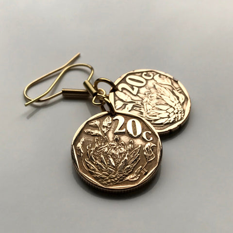 South Africa 20 Cents coin earrings King Protea flower plant Cape Town Johannesburg Pretoria Bloemfontein Port Elizabeth Limpopo Soweto Limpopo Nguni Bantu Zulu isiXhosa Afrikaans e000380