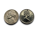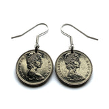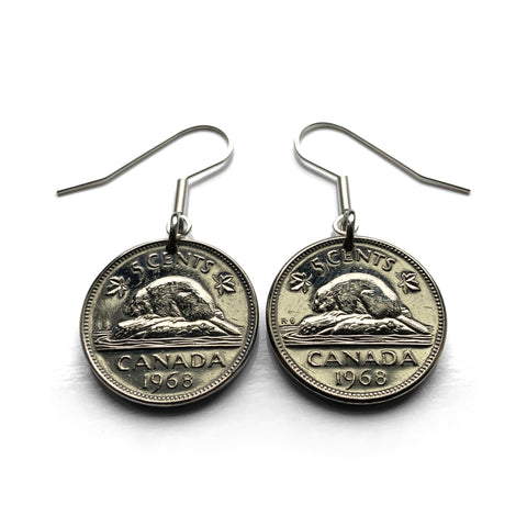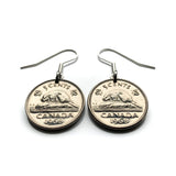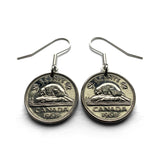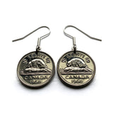1975 Canada 5 Cents coin hook earrings dangle and drop jewelry Canadian beaver maple leaves Queen Elizabeth II Ottawa Montreal Quebec Toronto Ontario Vancouver Calgary British Columbia Alberta Nova Scotia New Brunswick Manitoba Nunavut Victoria e000575