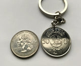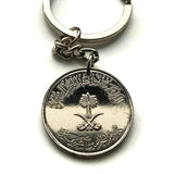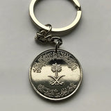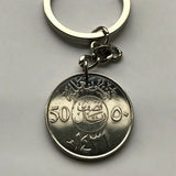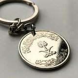 1988 Saudi Arabia 50 Halalah coin keychain or pendant necklace jewelry crossed swords palm tree Riyadh Hejaz and Nejd Jeddah Mecca Medina Persian Gulf Hofuf Najd Hafar Al-Batin Islam Mada'in Salih Yanbu Tabuk Hijri n001436