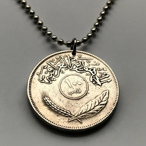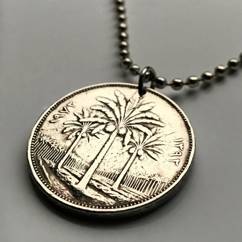 1975 Iraq 100 Fils coin pendant date palm tree Baghdad Mosul Basra Erbil Kirkuk Eyraca Arabica Middle East Tigris Euphrates Mesopotamia Sumerian Akkadian Empire Assyrian Kurdish Uruk Warka Sawad n002674