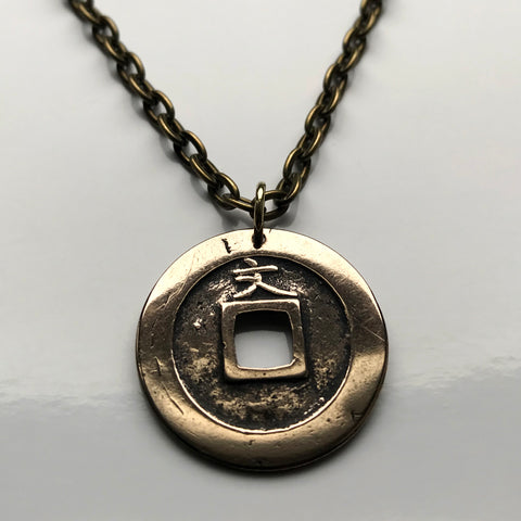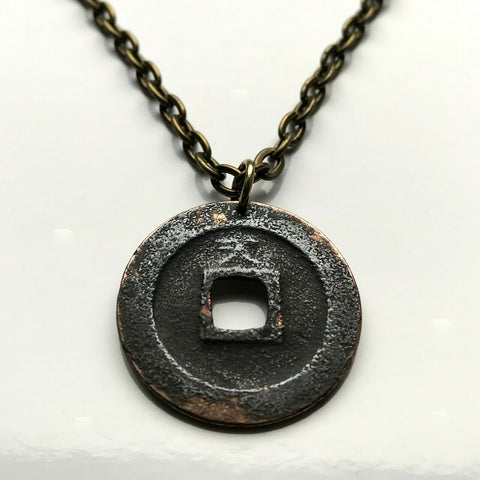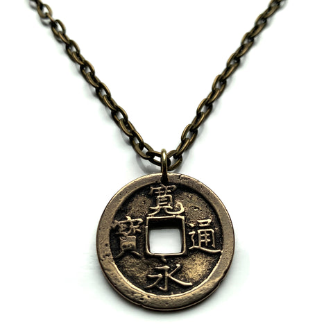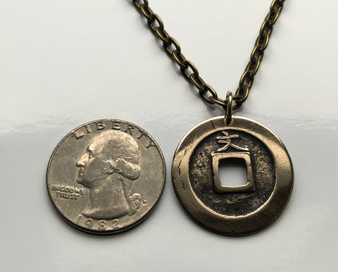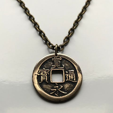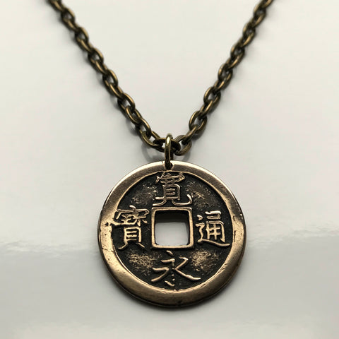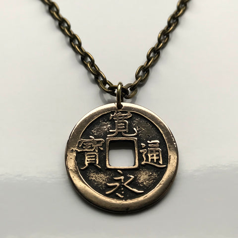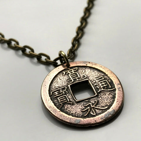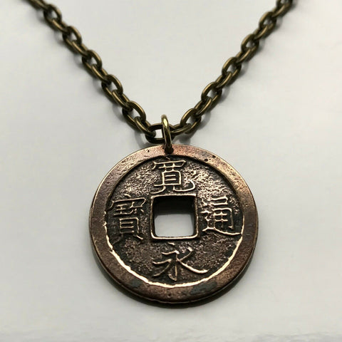 antique 1668-1700 Japan 1 Mon cash coin pendant Kanei Tsuho Kanji Fukuoka Kawasaki Saitama Hiroshima Sendai Chiba shogun Edo Nippon n001076b