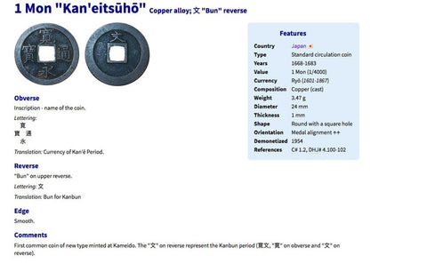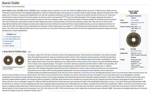 Kan'ei Tsūhō (Kyūjitai: 寛永通寳; Shinjitai: 寛永通宝) was an inscription used on Japanese mon coins from 1626 until 1868 during the Edo period. In 1636, the Kan'ei Tsūhō coin was introduced by the government of the Tokugawa shogunate as a means to standardise copper coins and keep up a sufficient supply of copper coinage, being the first government minted copper coin in 700 years. The government adopted them from after their successful introduction in the Mito domain 10 years prior during the 3rd year of the Kan'ei era. These coins would become the daily currency of the common people and would be used for small payments. Due to the isolationist policies of the Tokugawa shogunate, the outflow of currency halted and Kan'ei Tsūhō coins would continue to stay the main coin circulating in Japan. Kan'ei Tsūhō were minted for 230 years despite the fact that the Kan'ei era ended in 1643. Kan'ei Tsūhō coins would continue to bear the Kan'ei legend, even when a new denomination of the coin was introduced a century later. They were not all uniform as the shogunate had intended, as the mintage was outsourced to regional and local merchants who would cast them at varying weights and sizes, as well as occasionally with local mint marks. By the 1650s, 16 private mints were operating for the production of Kan'ei Tsūhō coins all over Japan.
