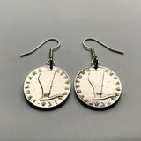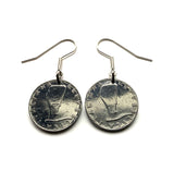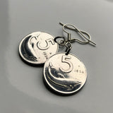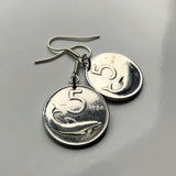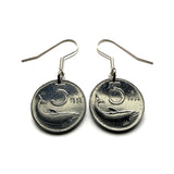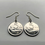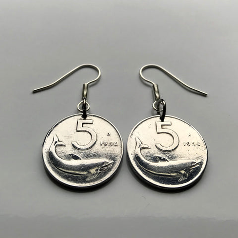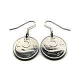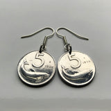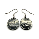 1953 Italy Italia 5 Lire coin earrings dolphin porpoise Rome Milan Florence Venice Verona Napoli Lecce Amalfi Pisa Siena Perugia Assisi Modena Matera Parma Bari Turin Bologna Genoa Ravenna Ferrara Cagliari Palermo Bergamo sea life beach ocean e000022