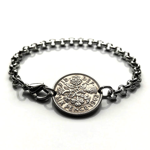 1962 United Kingdom Great Britain 6 Pence coin bracelet beach bridesmaid gift something old new English Tudor rose England Scottish thistle Scotland Irish shamrock Ireland Welsh leek Wales London Edinburgh Belfast Cardiff Manchester Newcastle b000064