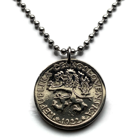 1922 Czechoslovakia 1 Koruna coin pendant Czech lion Slovak shield double cross Prague Bratislava Bohemia Moravia Charles Bridge Czech Silesia Praha Karlovy Vary Bojnice Cesky Krumlov Brno Plzen Kutna Hora n000180