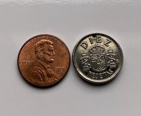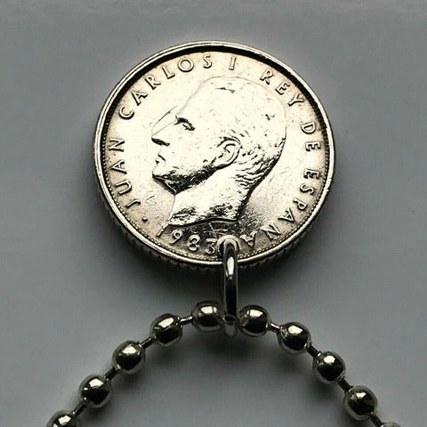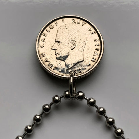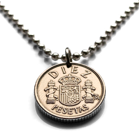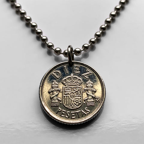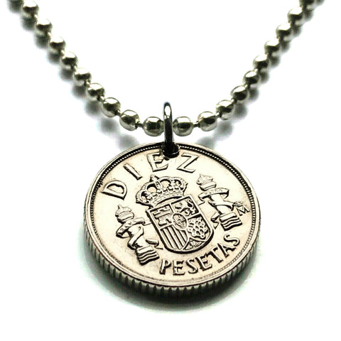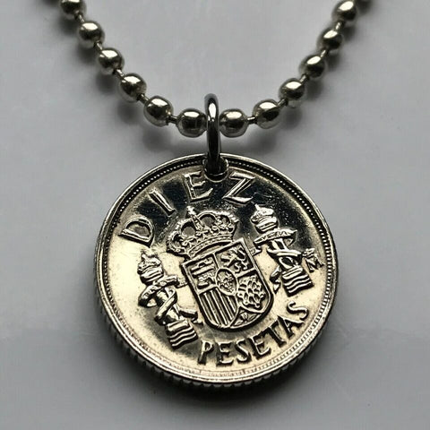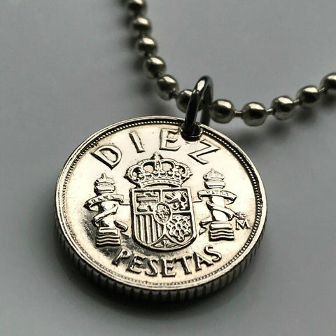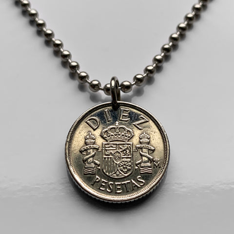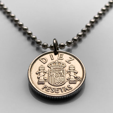 1984 Spain España 10 Pesetas coin pendant necklace jewelry Escudo Español Spanish crown Madrid Barcelona Sevilla Valencia Granada Zaragoza Toledo Cadiz Córdoba Castile Leon Aragon Navarre Andalusia Catalan Bilbao Coruña Salamanca n001634