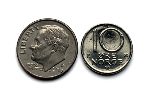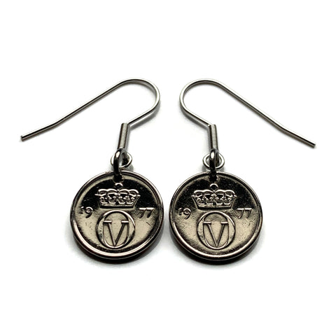 1977 Norway Norge 10 Ore coin earrings Norwegian crown initial O Oslo Bergen Stavanger Sandnes Trondheim Drammen Bokmal Nynorsk e000676