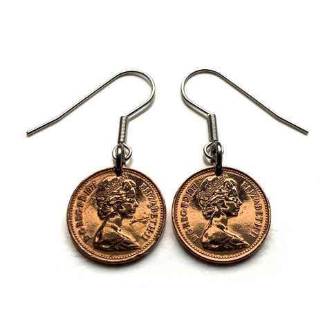 1971 England United Kingdom Great Britain 1/2 New Penny coin earrings jewelry Henry VII English crown House of Tudor London Manchester Birmingham Leeds Sheffield Yorkshire Liverpool Southampton Nottingham Newcastle Coventry Bristol Leicester e000379