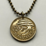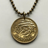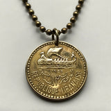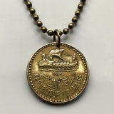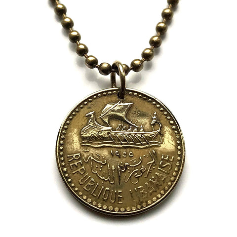 1955 Lebanon Liban 10 Piastres coin pendant Lebanese ship cedar tree Beirut Tripoli Jounieh Zahlé Sidon Aley Tyre Byblos Baalbek Batroun Nabatieh Zgharta Bint Jbeil Bsharri Baakleen Beqaa Valley Raouché Cedars of God Levant Levantine arabic n002418