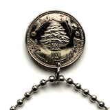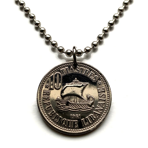1961 Lebanon Liban 10 Piastres coin pendant Lebanese Phoenician Bireme oared warship ship galley sailing boat mariners Mediterranean Sea Nahr el-Kalb river the Levant cedar tree Tyre Sidon Saira Byblos Beirut Tripoli Jounieh Zahlé Aley Beqaa n003824